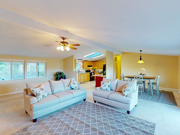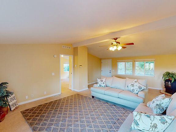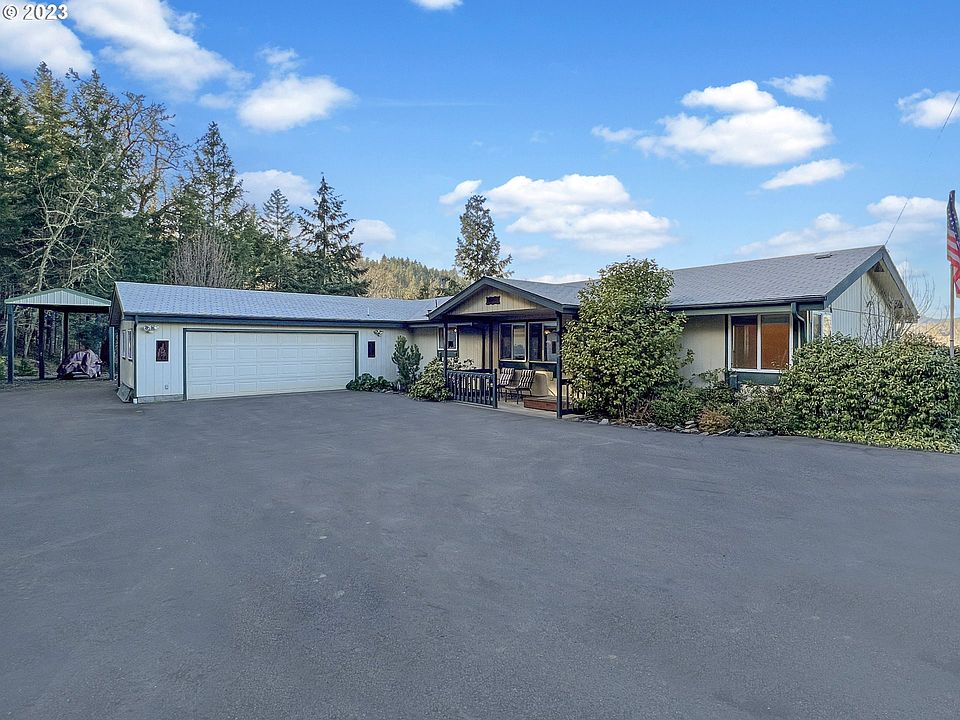 Secluded 3BR 2BA Country home w/beautiful views that sits on 5 private acres. Open floor plan w/ Split bedrooms, slider to deck to enjoy the beauty of nature right from your backdoor. Large primary suite w/ walk in closet. Laundry opens to oversized garage. Private paved drive with parking area and turn-out. RV Cover parking. Power transfer switch meter. Fenced Garden Area. nice mixture of trees and sunshine. Come see the beauty that surrounds this home today!