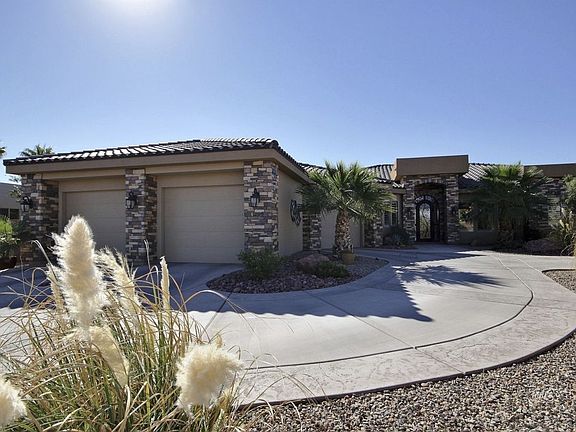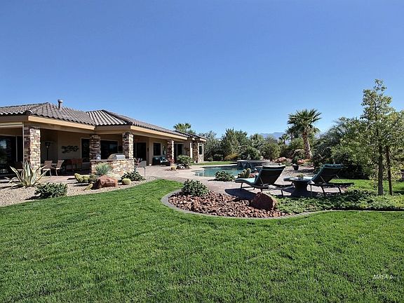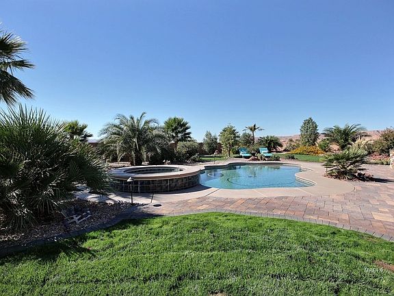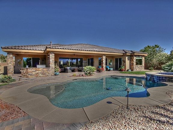 This exquisite custom home is located in Leavitt Estates, a thriving community south of I-15 promoting wide open spaces. Situated on a half acre lot, this desert Oasis offers complete privacy, a true resort setting, southern mountain view and tons of room inside and out. Nothing about this home is ordinary. The yard is absolutely gorgeous with well over $100,000 in landscaping and decorative pavers. The swimming pool is perfect for hot summer days and the hot tub is inviting year round. The spacious covered patio and built-in BBQ are perfect for entertaining. This masterfully designed and constructed retreat is ONE OF KIND in Mesquite and the attention to detail is unsurpassed. The home is surrounded by floor to ceiling glass providing light infused spaces and framing the outdoor tropical paradise. The ceilings are grand and the finishes throughout the home are exceptional. Features include a fireplace, dry bar, Plantation Shutters and Roman Shades, granite tops throughout, spa like bathrooms, high end stainless appliances and gas range, extraordinary lighting, beautiful cabinetry and surround sound. The 4 car garage and RV parking are ideal for vehicles and storage.