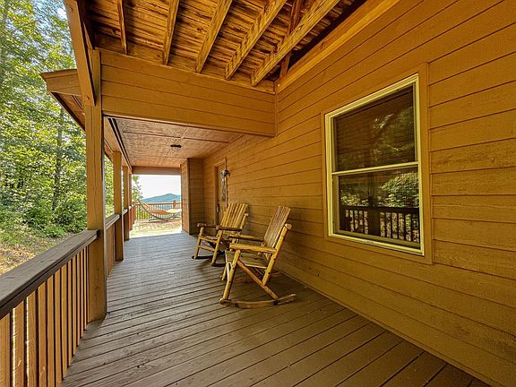 Gorgeous, private & well crafted chalet w/ long range mountain views comes fully furnished & ready to go. Covered porch leads to a huge open sun deck & into the great room w/ gleaming wood floors, high wood ceilings w/ open exposed beams & a wall of windows streaming in sunlight & opening the whole house up to the views. Beautiful cabinetry throughout and even linen closets! Main floor has 2 roomy bedrooms w/ a full bath, upstairs features a large, private master w/ balcony, walk in closet plus full bath w/ tiled walk-in shower. Bonus family/rec room in the basement w/ a second level of decking (would be perfect for a hottub) Lots of parking plus 1 car basement garage w/ workshop space - Well situated w/ close access to Blueridge GA, Ocoee water rafting, biking/hiking trails & Murphy NC.