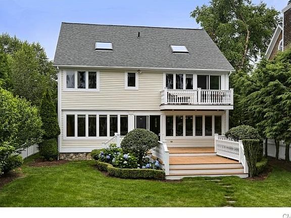 Great beach colonial with amazing water views from almost every room and private landscaped yard with your own boat dock! Pristine home with wonderful open and bright floor plan. Walking distance to beach, town, golf course and tennis. Main floor boasts gourmet EIK. Kitchen opens to sitting/breakfast area, formal living room, dining room and inviting family room with grand fireplace and vaulted ceiling and powder room. The second story consists of a beautiful master bedroom suite with balcony w/breathtaking views of Long Island Sound and master bath w/double large tub and walk-in shower. 3 additional bedrooms and full bath.The third floor guest suite/bonus room has full bath, sauna, high ceilings and skylights. Exceptional Beach Living!