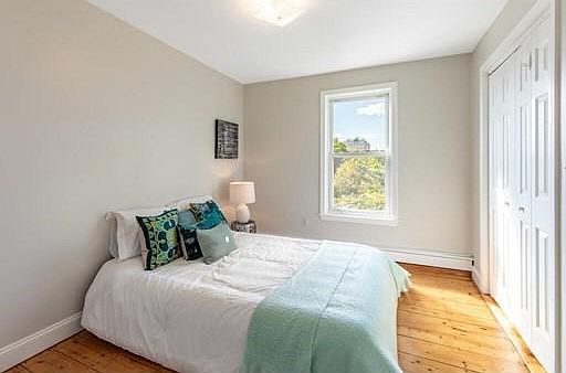 Cambridge Port / Riverside -This sun drenched top floor unit with a private deck and original pine wood floors exudes charm and enjoys A++ location, one block to W.F., the Charles River, next to tennis court & Hoyt field, and an 8 minute walk to both Central & Harvard squares. High ceilings, pine floors, light from morning to evening define this space which revolves around a gallery style hallway. The eat-in kitchen extends to a private deck to eat out or sip morning coffee. Spacious living room with bay-front windows. Two good size South-facing bedrooms with open sky view. In unit W/D. Exclusive roof rights. A 6-unit professionally managed building with common heat and hot water, dedicated storage in basement and shared back yard. Floors just refinished, walls & ceilings painted, ready for you to move in and settle in your new bright home.