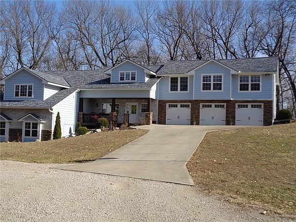 A rare opportunity to own one of only five homes located in the family friendly and quiet subdivision of Sandstone Hills! Only 15 minutes to Whiteman AFB, the home was built in 2001 and the three-car garage and huge bonus room were added in 2009. It features a number of new upgrades ensuring you can move in and enjoy the comforts of your new home. The lot is a spacious 5.38 acres backing up to the scenic and wooded Little Bear Creek area. Take the path down to the creek and enjoy nature and wildlife in your backyard. A new Owens Corning Pacific Wave shingle roof was installed in 2020. The entire exterior was also repainted in 2021. The kitchen and bathrooms have been tastefully updated, including new Mohawk RevWood Plus Waterproof Laminate Plank Flooring and super soft Dreamweaver Monte Carlo III carpet in the main living room, each installed in 2021. This home boasts an eco-friendly geothermal ground source heat pump system, a new 6-ton Hydron Revolution module installed in 2022, which is tied into the water heater (also replaced new in 2019). Propane natural gas supplies the kitchen range and a wall heater unit next to the laundry chute. The kitchen windows overlook a generous fenced, six raised bed garden. Your family will enjoy picking raspberries on the front right corner of the garden, apples from the apple tree in front, mulberries from the mulberry tree near the shed, and whatever you plant in the garden. Above the spacious three car garage is a giant bonus room with wet bar, a second refrigerator and microwave (both stay with the house), a perfect room for family gathering and hosting friends while enjoying the scenic sunsets out the front windows. Downstairs you’ll find three bedrooms along with a generous space in the laundry room, perfect for storage or an extra playroom. The 4.14 lot north of the property is also for sale, and the owner will consider a bundle price.