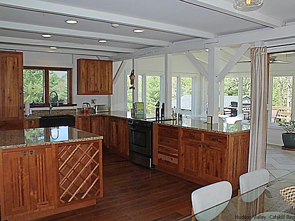 Mountain-Top Barn Living Meets Modern Elegance. Swim, stroll, hike, write a book in your artist cabin, play in the custom-built tree house, or eat a gourmet meal with a stunning view -- all on your own 8.80 acres! This extraordinary secluded estate is perched high above a tranquil country road and directly across from a pristine lake. The setting outside offers the fabulous combination of a plateaued lawn area enveloped by wooded mountains and majestic old-growth trees. Lounge in the sun by your heated in-ground pool or maybe on the bluestone patio -- rest and restore. There are two decks conveniently positioned just off the kitchen/dinning room and living room. The outside merges with the inside of this bright post & beam style home at every turn. Calm, country-quiet or fabulous entertaining from a gourmet kitchen featuring a Jennaire stove, oversized ceramic sink, generous island, along with abundant stone counter space and custom wood cabinetry that creates seamless sight lines with built in sub-zero refrigerator, and miele dishwasher. An open flow to the entire main floor which includes a wood stove that anchors the living room, and an open pass-through feel to an enclosed 4-season sun room with stunning Peekamoose Mountain views. The post & beam loft-like feeling follows you to the upper level to three ample bedrooms with vaulted ceilings, sky-lights, and two new gorgeous modern bathrooms. The en-suite master bath features designer MTI soaking tub and the second upstairs bath features a marble and glass mosaic "shower room" with oversized rain head. Both baths feature light pouring in from accompanying skylights. Complete walk-out lower level includes sizable family room, bedroom nook, office space, and a full bath -- all with it's own separate entrance. Great for an in-law or nanny suite, or deluxe in-home office. Separate fully finished two-car garage, currently used as owner's audio studio. Go for a long walk around the lake to work up an appetite for an alfresco dinner. Then, sit around the custom-built stone fire pit and gaze at the starlight while having a glass of wine or making s'mores... Only 12 min. to Stone Ridge, and close to High Falls, Kingston, and Woodstock/Saugerties and everything the Catskill Mountains and Hudson Valley has to offer. Think wine tasting, hiking, skiing, antiquing, river dining, kayaking...and much more. Complete privacy without isolation. A rare find where craftsmanship, modernism and abundant natural beauty unite to create the ideal Hudson Valley retreat.