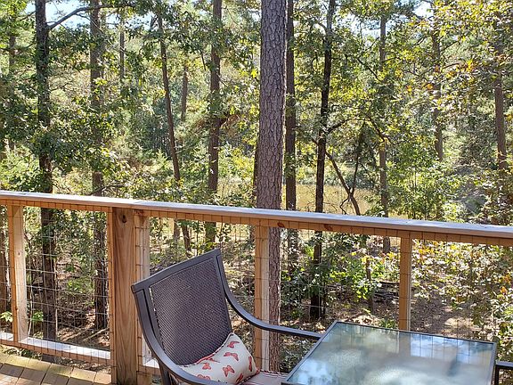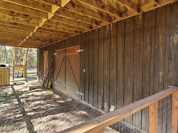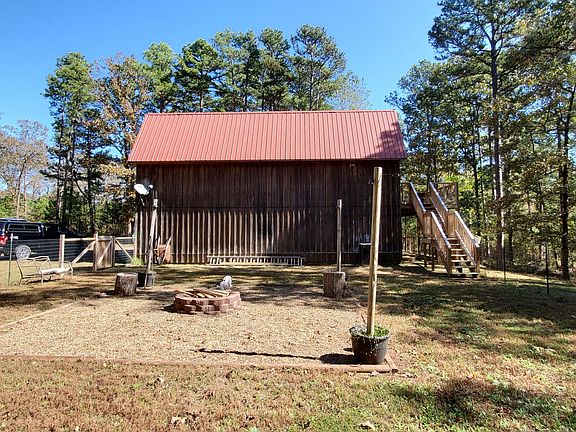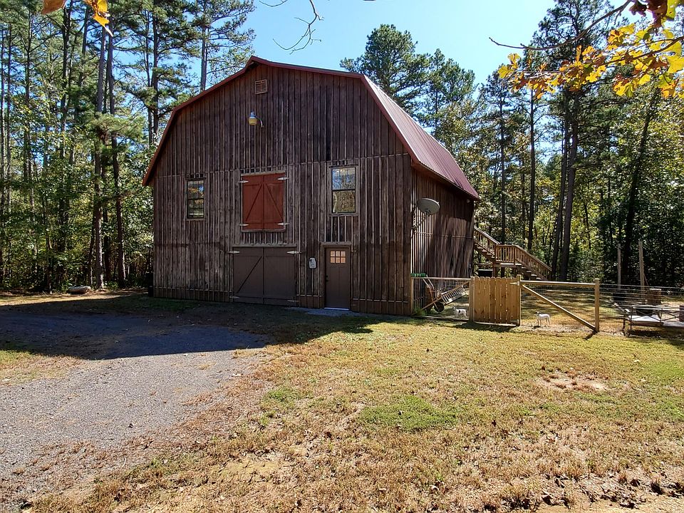 Rustic barn style house with garage downstairs. Metal roof, cedar interior walls. Staircase to loft. There are closets in the loft bedroom and in downstairs sleeping area. The tankless water in utility room downstairs. Deck on back overlooking the pond. Fenced yard with graveled sitting area with firepit also has fencing around deck railing for safety. Granite kitchen, commercial gas cookstove and vent. Refrigerator and propane tanks convey There is a wood stove downstairs, not hooked up, but will convey with the house. Very private setting to enjoy nature and wildlife. Square footage is what is shown in tax record. There is a loft and full first floor is utility, garage, storage.