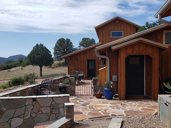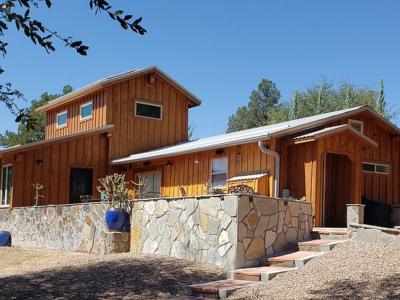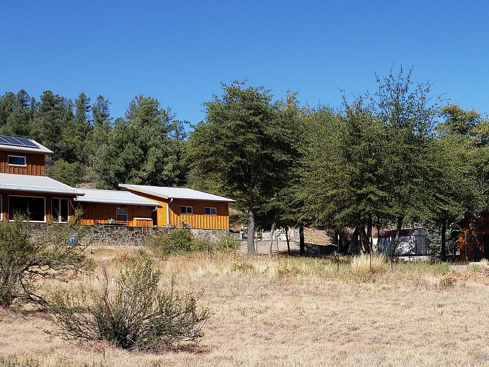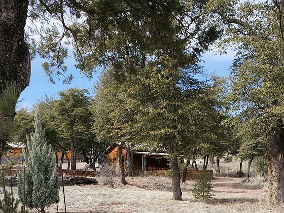 ONE OF A KIND! 2 hidden cabins on a very privately located 5 Acres with mature oak trees that backs up to Tonto National Forest! Main residence built to optimize the view, be protected from the wind, and shielded by a ridge and large old growth juniper trees on adjacent forest land. Custom-designed by a registered architect, the ''Morgan barn'' style main residence has a clerestory and huge picture windows, that welcomes morning sunshine! Each bedroom has hand-crafted armoires, custom-built shelving and bed stands for king size mattresses. Cabinets in kitchen and living area also custom-built from local distressed pine. 4 heating/cooling mini-split units allows for room-by-room climate control. Floor covering throughout and adjoining outdoor patio finished in slate rock. This home is a cook's delight with commercial size gas range cook top / 2 electric ovens / huge lighted exhaust hood, space for a beverage cooler in addition to the refrigerator/freezer, cabinet built to house small appliances, Italian white marble inset in the granite countertops at the coffee station and in the island, for rolling out pasta dough or pastry, as well as a backsplash above the kitchen sink. Glassware can be displayed on built-in shelves. Unique knife holder built permanently into the countertop! Enjoy meals on the moss rocked patio three seasons out of the year, while taking in the views of Catholic Peak and Vosburg Mesa on the Tonto National Forest east of Young. All outdoor furniture is cast iron, refinished and durable, with a classic look. A second patio is built adjacent to the flagstone steps for grilling and entertainment. Flagstone steps continue with the wraparound patio leading to the the smoke house. There's also handicapped friendly access from the driveway! Grill masters will like the custom-built charcoal grill in the fire box, plus stand-alone smoke house (a turn-of-the-century design originating from Univ of Nebraska) that has approx 6' X 8' smoke chamber with front and back air flow vents. The 24' X 16' site-built storage shed has an 18+/-foot high ceiling on west side, sloping to 10' on east side, plus stout shelving. A detached 560 +/- SF recreation building also functions as a 3rd bedroom and private place to sleep 3 - 6 guests; with furnishings that are included. Septic system is large enough that Buyer can add more rooms, without modifications to the septic system - subject to building permit process with Gila County. Attached covered patio has built-in storage cabinets and slate countertop, plus large table, 4 chairs, and rocked fire pit for evening entertaining. Patio is framed by an all-granite, dry stack stone with large planter. Gutter / down spout system on all buildings routes rainwater and snow melt to the oak trees and safely away from buildings. 6 irrigation lines feed the landscaping plants and shade trees west of the dry wash. Irrigation lines & bubblers are ready for planting more trees, beyond the existing 6 buckeye trees, maples, Arizona cypress and Arizona walnut trees. All utlities are underground with a solar system on the main cabin that feeds back into the APS grid system. This unique property has an end-of-the-road location and circular drive with shaded parking areas. Property is fully fenced with buyer having option to install a gate at the entrance. Total square footage report is for both heated / cooled buildings. Dusk-to-dawn lights along rock steps added July 2023. Water from well tested clean during escrow.