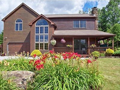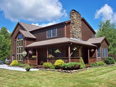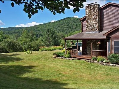 Privacy protected with lush greenery and mountain vista back drop is where you will find this incredible home that was built in 1995~the front foyer offers cathedral ceiling w. exposed stair case and floor to ceiling windows that brings those mountain ranges into full view~open living room w. stone fireplace w. pellet stove insert, formal dining room w. large windows illuminating the area nicely, beautiful maple floors, fabulous kitchen w. breakfast bar and eating area~first flr half bath and access to rear deck off from the kitchen~large master suite w. private bath again having a large window that brings in those incredible Vermont views~two additional large bdrms, full bath and large central area complete the second floor~attached 2 car garage and detached garage/shed for additional storage~large wrap around porch w. exterior stone exposed chimney~open grounds with berry bushes and numerous floral areas~perfect year round home or second home~Pristine condition.