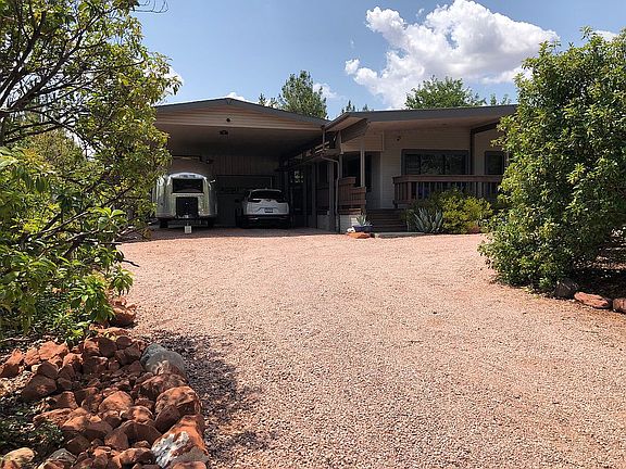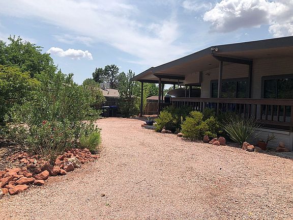 PENDING -- TAKING BACK UP CONTRACTS. UNIQUE IN ALL OF SEDONA – FIVE BUILDING COMPOUND WITH PRIVATE PATIO COURTYARD AND COVERED PARKING FOR THREE OR MORE VEHICLES INCLUDING AN RV OR BOAT. THIS PRIVATE WEST SEDONA RESIDENCE WAS ONCE THREE SEPARATE RENTALS AND COULD BE TURNED BACK INTO THREE WITH A MINIMUM OF EFFORT AND INVESTMENT. A FEW BLOCKS FROM SHOPS, RESTAURANTS AND MULTIPLE HIKING TRAILS. BUILDING ONE: “MAIN RESIDENCE”: Completely renovated 864 SF manufactured home with one bedroom, ¾ bath and open plan living room, dining room and kitchen with granite counter tops, granite breakfast bar and stainless appliances. Updated plumbing and electrical, wool Berber carpet, easy care wood-look vinyl flooring, hand-troweled stucco walls and lots of custom recessed lighting. Brand new central air conditioning, gas heat, an evaporative cooler, gas hot water, water treatment system, custom 2” wood blinds, stucco built-in shelves and louvred doors throughout. BUILDING TWO: “GUEST CASITA”: “Stick built” 442 SF guest casita (2000) with full bath, terra cotta tile floor, pine cabinets in main room and walk-in closet and vertical blinds on ample picture windows. Evaporative cooler, ceiling fan, electric baseboard heat and its own gas water heater. Custom stucco shelving, 2 skylights and lots of recessed lighting. A charming space for guest accommodations, a home office, art studio or a vacation rental. BUILDING THREE: “2 STORY METAL GARAGE/APARTMENT/WORKSHOP”: Ground floor of this 2,000 SF pre-fab building has a ¾ bath and washer/dryer nook, combination carpet/wood-look vinyl floor, gas wall heater, evaporative cooler and mini-split air conditioner, “party frig” and built in cabinets galore. Two automatic garage doors (one car size and one over-size for RV or boat) open to adjacent carport. Full RV hookups on drive just outside of garage include electric, water and sewer. This building has its own electric hot water heater and water treatment system. Second floor fully carpeted including stairs. Step up bedroom space and built in formica counter with recessed lighting and pop-up ceiling ventilator panels. MORE built in cabinets. BUILDING FOUR: “GARDEN SHED”: 84 SF shed with electric lighting and receptacles. Floor to ceiling shelving on two sides. Silicone coated roof and gutters. Wood deck wraps around two sides. BUILDING FIVE: “WOOD SHOP”: Built to be a hobby project space, this “L-shaped” 104 SF building features a work counter, overhead lighting, multiple cabinets, shelving and electrical receptacles. Linoleum floor. Wood deck on two sides. Two windows. GENERAL FEATURES: Buildings One, Two and Three are joined under a custom designed common roof which also forms a roof over the back patio. Easy care DG gravel front and back with red landscape rock accents. New (2 years) stucco wall on back property line. The north carport includes built-in storage cabinets, an outdoor utility sink and a large closet with shelves and a wardrobe rod for storage/mud room use. In the northwest corner of the back garden at roof level is a 12 x 16 “sky deck” for red rock viewing. SHOWN BY APPOINTMENT ONLY. 3% commission to buyers' agent. DIRECTIONS: From 89A in West Sedona, turn north onto Harmony Drive to a left on Lyric Drive. Take next right onto Windsong Drive. House is on the left just past Moonglow Drive.