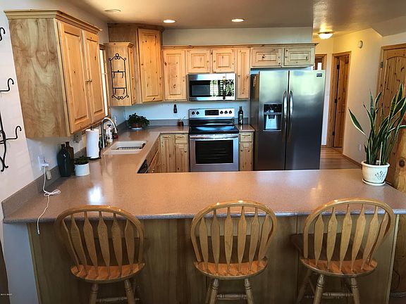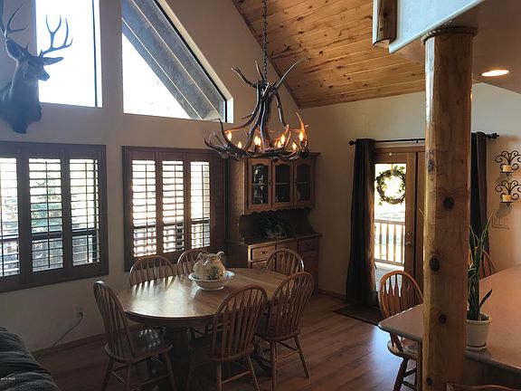 BEAUTIFUL CABIN IN THE PINES. 3 bed, 2.5 bath, on almost 3/4 of an acre. NO HOA Community to tell you what to do. Oversized 2 car garage with lots of built in cabinets for storage. Open floor plan with stacked stone gas fireplace. Hickory cabinets, solid pine doors and trim. Lodge pole stair rail and Aspen wood vaulted ceilings. Wrap around wood covered deck. Raised garden beds all fenced for you gardening enjoyment. RV hook up already for your RV or 5th wheel. Large walk in shower with travertine tiled walls and floor in the master bath. Propane tank is owned, central A/C, with real Elk horn Chandler! Pride of ownership shows through out this house! Come check out this little piece of HEAVEN!