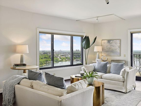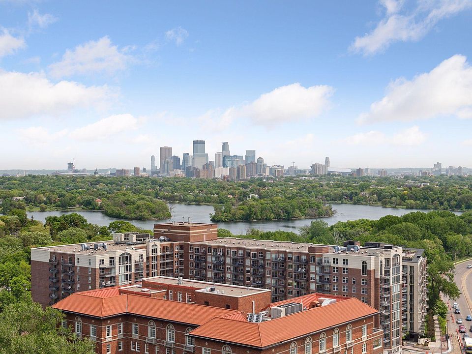 The spectacular views of Bde Maka Ska, Lake of the Isles, Downtown and Uptown only add to the wow factor of this nicely updated unit. High ceilings, a gas fireplace, cooks kitchen and an expansive owner's suite make it easy to enjoy. Watch the sun rise from your balcony or set from the west facing windows in the kitchen and bedroom wing. Convenient location in a building full of amenities; 24 hour concierge; secure parking. Come and go as you please whether walking the lakes or enjoying the Metro.