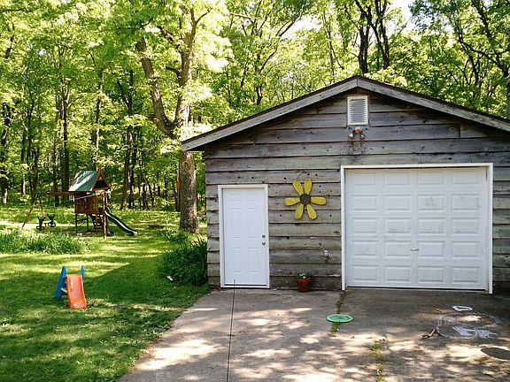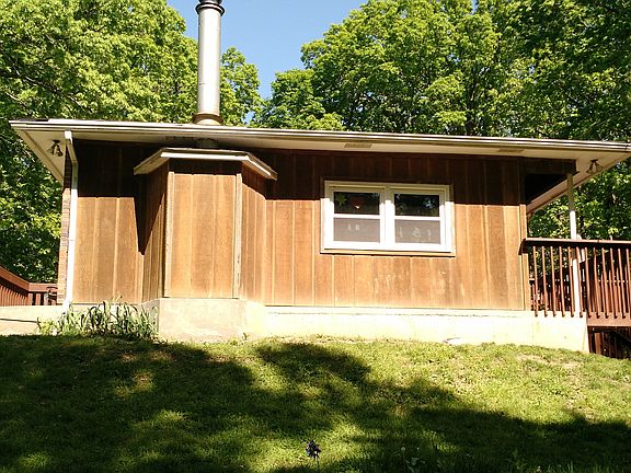Open floor plan 3 bedroom ranch with hardwood floors and kitchen cabinets. Kitchen walks out to deck for easy grilling and outdoor dining. Wood stove heats whole living space. Solid foundation. Large open room in basement and small office. Basement walks out onto patio also handy for dining and relaxing. Detached one car garage has lots of space for tools, restoration projects, and outdoor toys. 8+ acres features pond, creek, and forest paths. Has good backstop for archery or rifles. New roof, windows, furnace, AC, hardwood flooring, pressure tank, and much else in last 6 years.