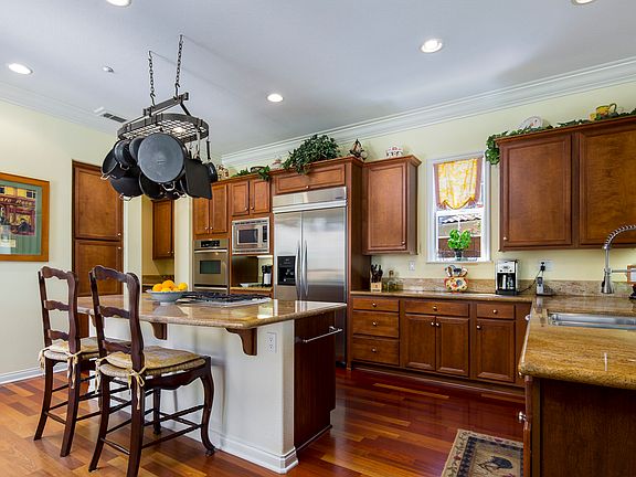 Welcome to warm and inviting elegance of a 5 bedroom, 4.5 bathroom home in the exclusive community of Villagio. Only minutes to the beach, schools, shopping, restaurants, golf and more. No homes in front or behind for maximum privacy on a serene cul-de-sac. The main floor has an incredible flow and open feeling. The kitchen features granite counter tops, beautiful wood cabinetry, stainless steel appliances with a large center island. Dual sided fireplace warms the breakfast area and the large adjacent family room. Elegant custom shelving and cabinetry are found throughout the home as are stylish plantation shutters. Guest bedroom with en suite bathroom on the main floor. The large master suite occupies it own separate wing of the second floor. The master bedroom has a fireplace and views of a quiet creek. The master bathroom is spacious with a big soaking tub, oversized shower enclosure, his and hers vanities with makeup station. All of this is bathed in marble and natural stone. There is an additional retreat within the master suite which may serve as a nursery, home office or any number of practical uses. There are three large bedrooms upstairs, one en suite bathroom. The other two bedrooms share a Jack and Jill bathroom that has two exclusive use toilets and two separate vanities. The tub/shower enclosure is the only shared part of this configuration. There are generous sized closets in all the upstairs bedrooms. The lot is .23 acres and has a large fully fenced backyard. The front yard has an amazing patio perfect for enjoying time socializing with friends and neighbors. This is one of those special streets and one not to be missed. Welcome home!