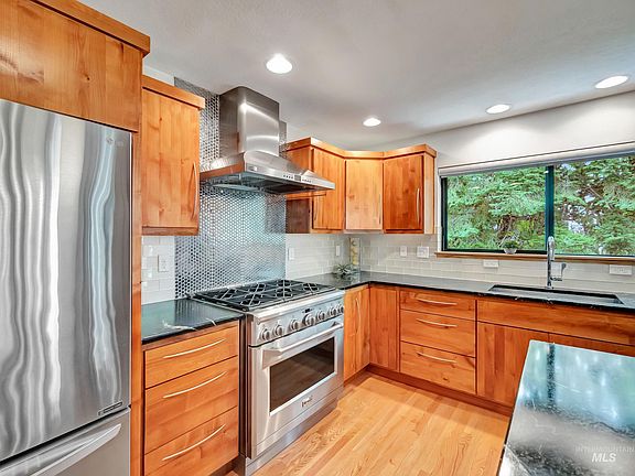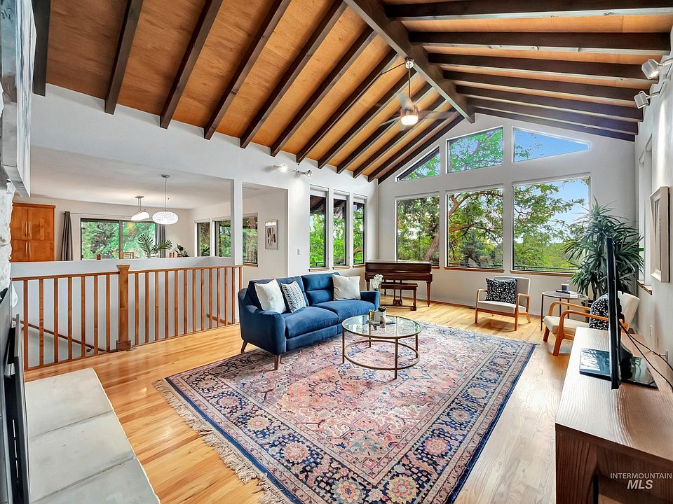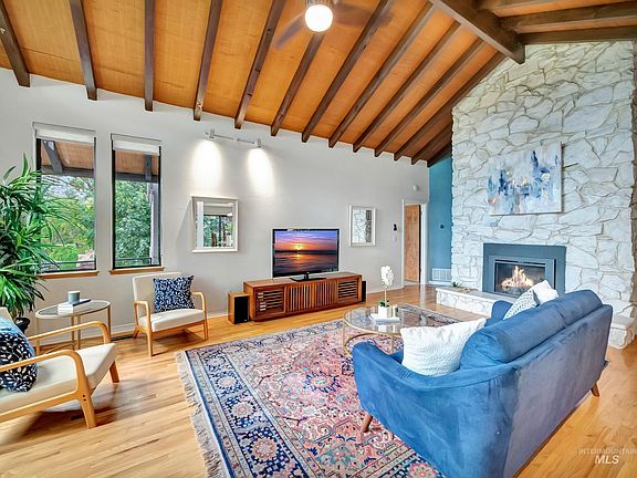 This home features a modern and elegant design with a mid-century flair, stunning views of the valley and mountains, as well as easy access to trails, parks and downtown. It has everything you need to enjoy the best of Boise living. Main level features a spacious bright great room w/ a gas fireplace, and a wall of windows showcasing amazing views of the valley and mountains. Wood beamed vaulted ceilings and a stunning mid-century inspired stone fireplace add character and charm to the interior. The renovated kitchen is a chef's dream with a breakfast bar, island, pantry, and stainless-steel appliances. The primary suite has a walk-in closet, dual vanities, and a tile shower. The lower level has a family room with wood burning stove, three bedrooms, a full bath, and a utility room. Outside is an oasis with a water feature and pond, wrap around balcony, and garden space. Located on a private lane, this home is conveniently close to Boise foothills, Hyde Park, Downtown, Whitewater Park and the Greenbelt.