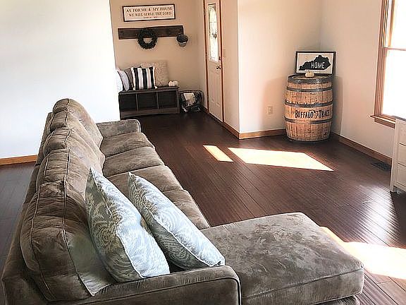 Custom-built brick ranch on 4.45 acres in quiet country setting. Open floor plan with cathedral ceilings and hardwood floors throughout main level. Finished basement with many features for entertaining, including small kitchenette and cozy fireplace. Large garage on main level, with extra garage off basement. Screened-in porch overlooks beautiful rolling hills. Located just 15 minutes from I-71.
