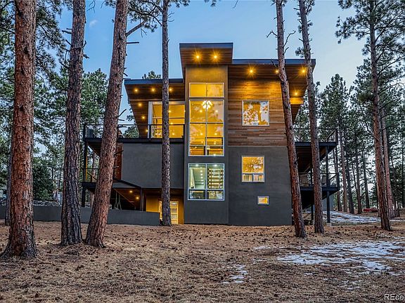 Live, work, and play in modern luxury. Welcome to this architecturally stunning home in North Evergreen- designed to impress and inspire. The unique butterfly roofline carries windows to the ceiling, inviting nature right in. Five outdoors living spaces allow for both privacy and creative entertaining ideas- spacious enough for large parties or intimate enough for outdoor movie nights on the deck TV. Accessed by a unique bridge design from the garage, the main floor greets you with a vintage Loveland ski chair and spills into jaw dropping design including dry bar, gourmet kitchen with premium appliances and double dishwashers, huge island, custom cabinetry, enormous pantry, built-in seating, and the crown jewel 9-ft cantina-style window, opening fully to the outdoor dining space to mingle with friends or soak in the gorgeous treetop views. A glass stair tower leads to the bedroom level with 3 bedrooms, office, owners suite, and conveniently located laundry room. Your private deck on the owners suite takes you to the Wind River Spa and outdoor shower. The lower, walkout level has a bunk room to sleep 3, fifth bedroom, 6-person movie theater, living room, and two playful garage doors opening to the large and level yard. The home was originally built in 1969, but entirely reworked and rebuilt in 2016 from the ground up with the help of Shipley Design. A nod to the original structure, original beams were salvaged and lovingly repurposed into a custom bathroom vanity and fireplace mantle. Radiant floor heat throughout. Double deep garage will accommodate plenty of toys. Professionally mitigated trees on 1.42 acre lot and custom stonework outside. Located in an award-winning school district just 53 miles to the Denver Airport and under 35 minutes to Denver, this location can't be beat. Don't miss your opportunity to call this one-of-a-kind masterpiece yours.