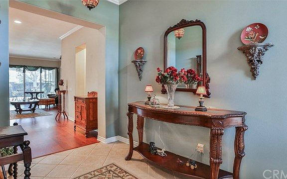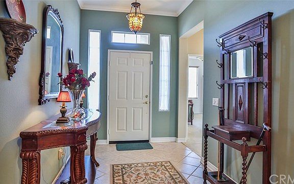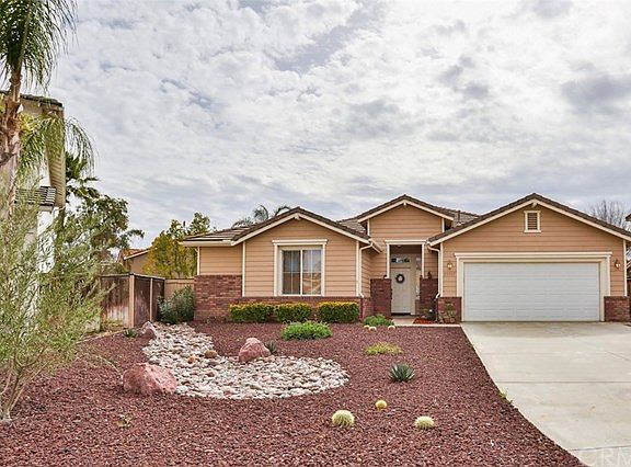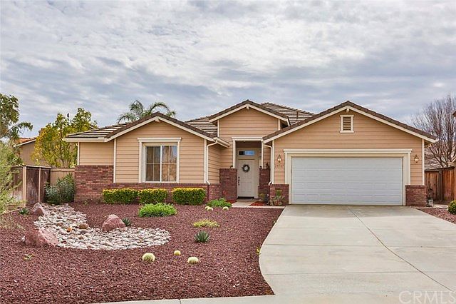 Single Story living at its best . You'll fall in love with this open, well designed floor plan. The grand entry features a tiffany style chandelier and leads into the Formal Living Room. Large pillars mark the entrance to the formal dining room. The kitchen has a large island and breakfast bar, stainless steel appliances, upgraded tile counters, backsplash and ceramic tile flooring. Custom door in kitchen takes you to a large shaded patio and a detached work shop. The home features laminate floors ,and crown moulding. Kitchen and bathrooms have ceramic tile flooring. Master bedroom with bath offers 2 walk in closets, separate soaking tub, shower, dual sinks & vanity. Two bedrooms at the front of the home share a Jack & Jill bathroom. The 4th bedroom would make a great office, located in it's own hallway with another full bathroom nearby. Ceiling fans throughout. Extra large laundry room with a sink & lots of cabinet space. Access to the backyard from the living room, kitchen, family room & the master bedroom. There's even a doggie door! The yard features water wise planting & low maintenance hardscape & an over 10,000 square foot lot. There is a covered lanai at the back of the house, perfect to enjoy your morning coffee. The house is walking distance to elementary school & local parks, close to shopping & an easy commute to freeways. Located just a short drive to the world famous Temecula Wine Country & Lake Skinner. No HOA! This one won't last!