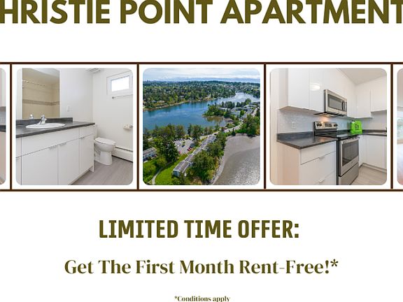 AboutWelcome to Christie Point Apartments and Townhouses. Located in the highly sought-after neighbourhood of View Royal and only 15 minutes to downtown Victoria. Christie Point consists of five two-story apartment buildings with spacious two and three-bedroom suites and four two-story townhome buildings with three-bedroom townhomes for rent. Admire the amazing waterfront views of Portage Inlet from your rental suite. Heat and water are included in the rent for your convenience. Select suites have a storage room and all suites have a hot water tank. The townhome suites feature in-suite laundry and select townhomes and apartments feature a dishwasher and over-the-range microwave. Community AmenitiesStorage SpaceOn-Site Professional ManagementSuite AmenitiesBalconiesUtilities IncludedHeat
