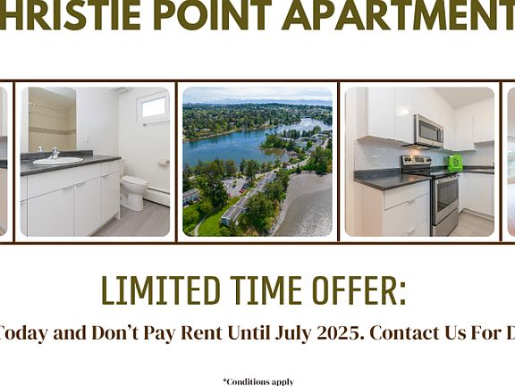 About**Limited-Time Offer: Move In Today & Don't Pay Until July 2025. Contact Us For Details.** Welcome to Christie Point Apartments and Townhouses. Located in the highly sought-after neighbourhood of View Royal and only 15 minutes to downtown Victoria. Christie Point consists of five two-story apartment buildings with spacious two and three-bedroom suites and four two-story townhome buildings with three-bedroom townhomes for rent. Admire the amazing waterfront views of Portage Inlet from your rental suite. Heat and water are included in the rent for your convenience. Select suites have a storage room and all suites have a hot water tank. The townhome suites feature in-suite laundry and select townhomes and apartments feature a dishwasher and over-the-range microwave. Community AmenitiesStorage SpaceOn-Site Professional ManagementSuite AmenitiesBalconiesUtilities IncludedHeat