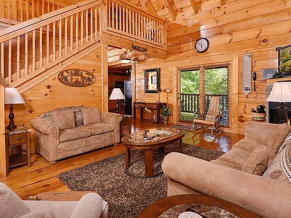 Stainless steel appliances, new bedding, and recently replaced carpet add to this well-furnished cabin. A pool table, arcade game, and a theater space are attractive to potential renters. Spacious open floor plan on the main floor. Let this beautiful cabin be your next investment.