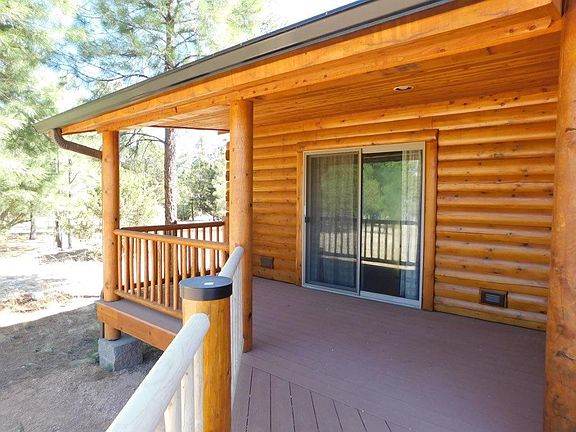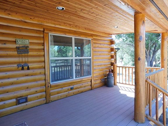 Full log cedar chalet in the pines! The 3Bd/2Ba D-log post & beam home has so many upgrades you'll notice the minute you enter the open greatroom with soaring vaulted cedar ceiling. Stacked stone behind the woodstove, central gas heat, A/C, beautiful oak hardwood, Porcelain tile & carpet in LR & BR, split floorplan (guest BR has private bathroom access to use as a 2nd master BR) and all rooms are downstairs PLUS a huge loft for game room, extra sleeping area or office. The chef's delight kitchen will WOW you from the rustic hickory solid wood cabinets, quartz countertops, pull out soft close drawers, hi-end appliances, gas range has a pot filler, large island has tons of storage, vegetable sink, under cabinet lighting & custom built in mixer w/folding shelf. There's a wet bar