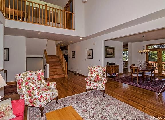 Nestled on one acre of property adjacent to open space gives the feeling of privacy even while being a part of the most coveted neighborhood in Evergreen. This light and bright home was obviously designed with families in mind as the spacious master suite upstairs is privately tucked away even though it shares the same floor with 3 extra bedrooms. The addition of hardwood floors on the main level helps with the low maintenance of an active family along with an open floor plan. Downstairs is a large rec room area that comes fully equipped with a built-in bookcase, 2 more bedrooms and a full bathroom. Oversized private deck, playground area, and 3 car oversized garage make this home complete. Personalize this home by adding updates of your choice. Convenient location for commuters, schools, grocery stores, and appropriately located at the end of the cul-de-sac for quiet privacy.
