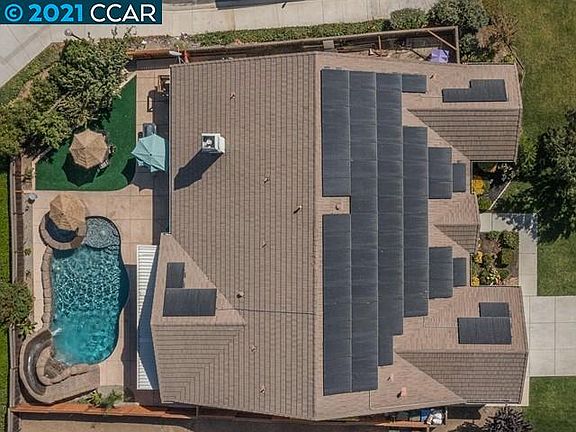 Solar panels (83) with 25-year warranty & 10-year roof warranty; new technology gas-heated Tahoe Blue Mini Pebble Pool (made of Abalone and glass beads) stair & slide, Grotto, multi-color lights, beautiful mosaic designs in bottom of pool & spa; pool sweep, pool nets and brush; Energy Star Appliances, HVAC, Low Flow Shower/Toilets, (2) WIFI Nest Thermostat Controllers; Lifeproof Oak Luxury Vinyl Plank flooring; 5 baseboards & crown molding; formal dining room with chandelier and steps away to butler pantry with wine refrigerator; family room gas fireplace with Wainscoting mantle; ceiling fans in bedrooms & family room; can lighting in several rooms; built-in entertainment center in family room; laundry room w/sink & clothes rack; Jack & Jill bathroom; built-in closet organizers; Wainscoting in hallways, formal dining and half bath; kitchen has custom tiled backsplash, custom range hood, granite sink, appliances: 42" Built-in GE Professional Refrigerator; fresh interior paint 2021