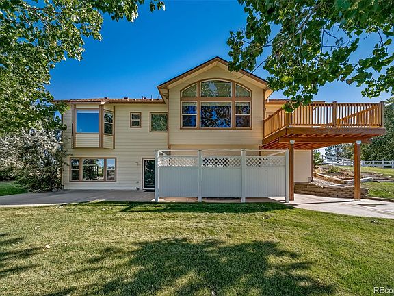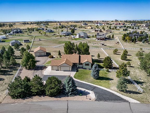 This home has it all! Situated on 1.5 acres of land, this 3 bedroom/2 bath home also has lots of updates, a walkout basement, a 3-car garage, and a 1200 square foot outbuilding! This ranch home is nestled behind a row of pines and blue spruce, creating not only a serene view, but privacy as well. The covered front porch leads inside to an open foyer, revealing an impressive great room with a vaulted ceiling, and rows of windows that bathe the space in natural light. The great room features luxury vinyl plank flooring, has a cozy gas fireplace for cool fall evenings, and encompasses a formal dining room space with patio doors leading out to the deck for a convenient spot for grilling. The kitchen has been remodeled with elegant granite slab countertops and matching slab backsplash, and has fresh black stainless steel appliances, including split oven with gas range, dishwasher, microwave, and a french door refrigerator, all included! The kitchen also has a bay window creating an informal eating space, and a huge pantry! The spacious primary bedroom has a walk-in closet, vaulted ceilings and bay window view of the backyard. The en suite has double sinks in a granite countertop, an oval soaking tub, and separate shower. The secondary bedrooms are both generously sized and share a hall bath, highlighted with granite counters. A laundry/mud room (washer and dryer included), leads out to the 3-car garage, which has access to the backyard and outbuilding. The partially finished walkout basement is the perfect blend of storage and workshop space, as well as a family hangout with pellet stove. Step outside the basement to access the hot tub, included, for easing sore muscles and relaxing. The outbuilding is 40 X 30, with two garage doors and a separate access door, concrete floor, and cabinetry, and it's heated too! This home is perfect if you want a bit of the country life, but still be within minutes to Parker. Come view this home now, it won't last long!