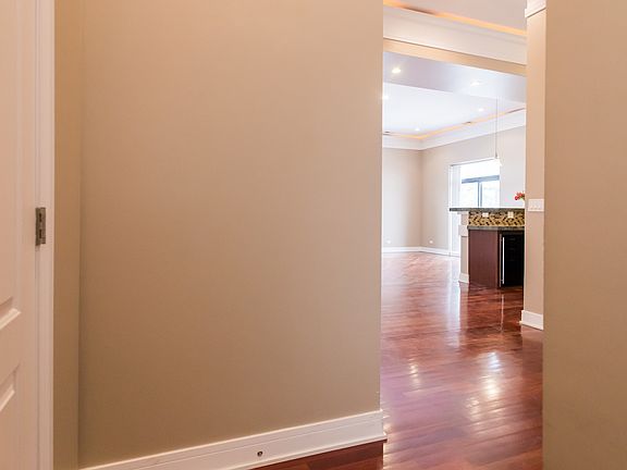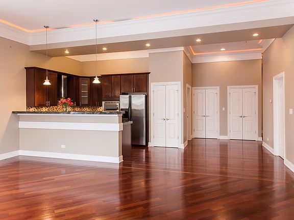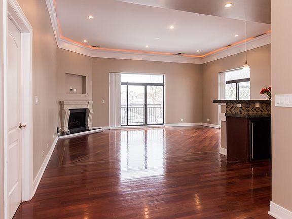 View our virtual 3D tour! Boutique elevator building with sunny open floor plan. Very large 2 bedroom/2.5 bath condo, with 12ft ceilings, recessed lighting, and cherry hardwood floors throughout. Deluxe chef's kitchen includes wine cooler, breakfast bar, granite counters and SS appliances. Opens to spacious living/dining room with fireplace and leads to large balcony. Deluxe master suite with separate balcony, deluxe bath with steam shower and jacuzzi tub. Large second bedroom with ensuite bath. In unit utility room with full size laundry and great storage. Fitness room, rooftop deck with grills & beautiful city views. Steps to public transportation, expressway, shopping & dining. Tons of space and nothing to do but move in!
