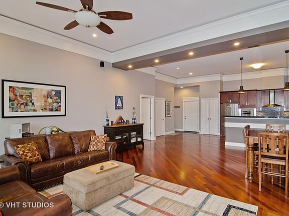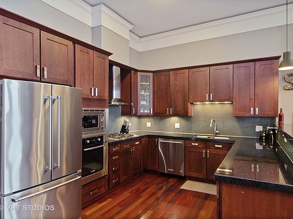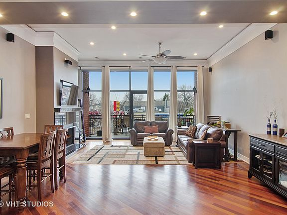 Super, Super Sunny and Spacious Highly Upgraded 2 bed/2.1 bath newer construction condo near Horner Park! You will not find rooms or closets of this scale anywhere! Dramatic 11' tall ceilings and floor-to-ceiling windows give the space a lofty feel. Elegant crown molding, Brazilian cherry hardwood floors and two massive bedrooms with en-suite baths & walk-in closets. Huge open concept kitchen with 42'' dark stained cabinets, extra thick granite counters & upgraded stainless steel appliances. Both bedroom baths have all marble floors and walls, double vanities and vessel sinks. Master bath feels like boutique hotel room with oversized spa tub and spacious steam shower, body sprays and rain shower! Gas fireplace, all rooms pre-wired for sound and cable. Great utility/laundry room with side by side washer/dryer and lots of room for storage! Half bath for guests! Fitness room. Roof deck with panoramic skyline view! All Brick & Limestone Elevator Building. TWO OUTDOOR AND ONE INDOOR PARKING SPACES INCLUDED!!!