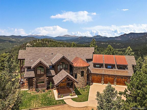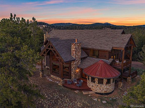 Gorgeous D Log custom home on 40 pristine acres with sweeping Mt. Blue Sky & Lions Head views. Backing to a 320 acre private reserve. This is paradise! (The main home is 7,579 SF, 4BR, 4.5BA. Guest Cabin is 1265 SF, 2BR, 1BA. Plus 821 SF Barn/Shop.) Impressive from the minute you arrive. The log & stone architecture, turrets with metal roof accents and elevation is stunning. The front porch opens to a welcoming foyer with travertine floors and closets behind old world doors. On to the huge great room with expansive windows that fill with views, soaring ceilings with cathedral beams, stone fireplace and reclaimed hardwood floors. A beautiful wet bar, 200 bottle wine cellar, billiard area and open dining area too. The gourmet kitchen is all "wow." Double thick granite, dual islands, Sub Z, Wolfe gas stove & cooktop plus induction cooktop. Custom cabinetry, cozy gas fireplace, breakfast nook and designer touches. On to the stone and timber round room. Plus a powder room and guest suite with ensuite bath. Relax and entertain on the deck or patio with fireplace. Upstairs you'll find more views! From the open air loft to the expansive primary bedroom with it's spa-like bath with jetted tub and steam shower. Dressing room and private balcony. To another bedroom currently used as the office, with it's ensuite bath and whimsical loft. A large laundry room and the forth bedroom with ensuite bath completes the upstairs. An over-size 3-car garage with EV charger, mud room and bonus artist studio room off garage completes the main house. On to the 2 bedroom, 1 bath, historic cabin. This one is "Post Card Charming." Perfect for guests looking for that cabin get-away or property caretaker home. Other features include the barn with turn-out, tack room and frost proof water. Generac Generator. Excellent location, less than 15 minutes to restaurants, shops, Safeway, schools and Staunton State Park. This is your unparalleled opportunity to own a significant mountain estate!