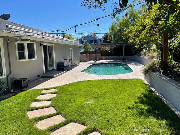 Gorgeous single-story rancher in Pleasant Hill situated on a large corner lot. This light and bright home offers four bedrooms, two bathrooms, and an expansive family room and kitchen. The kitchen comes equipped with white cabinetry providing a ton of storage, a farmhouse sink, and stainless steel appliances which include, a refrigerator, gas cooktop, oven, and dishwasher. There is counter seating for two, an additional eat-in kitchen nook with built-in bench seating, and a separate bar area with a wine fridge and frosted glass cabinet doors. The backyard is a true oasis with a sparkling pool, Pergola with built-in ceiling fans, and a darling grass area for play. The primary bedroom has it's own access to the backyard with a private sitting area. Lots of mature trees and plants provide a serene setting whether you're outside relaxing by the pool, or enjoying the views from the primary bedroom and kitchen. The owner will pay for the gardener and pool maintenance. Tenants are to pay for all utilities. Will consider cats and small dogs.