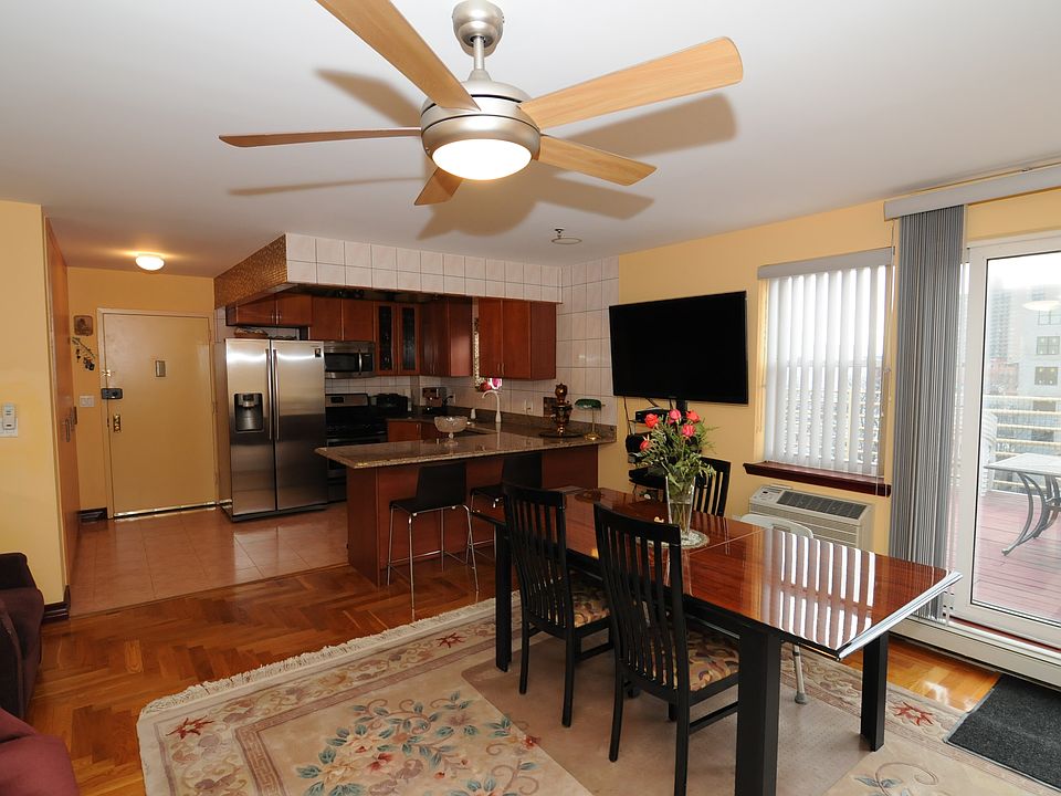 Unique 3 bdr/2 bth penthouse with exceptional outdoor space. Unit features large open living and dining area, open concept kitchen with stainless steal appliances, three large bedrooms and ample custom built closets, hardwood floors. Eastern and Western exposure. Gorgeous 400 sq ft. terrace. Indoor garage parking included in price. Tax abated for 7 more years!