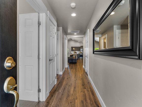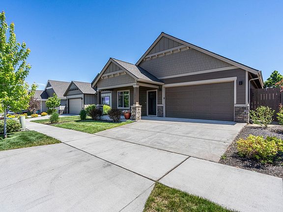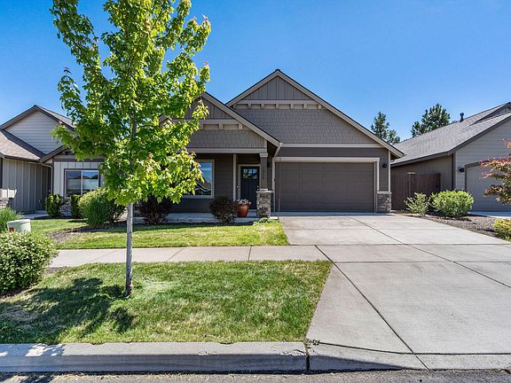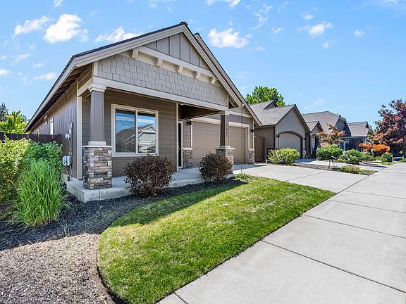 Explore this inviting single-level home in the NE Bend community of Mirada! Built by Franklin Brothers in 2019, this home features 3 beds and 2 baths with a spacious Great room floor plan and vaulted ceilings. The kitchen has a large island, quartz countertops, and stainless-steel appliances. Enjoy a sizable primary suite with a walk-in closet and a bathroom with dual vanities, tiled shower and backyard access, perfect for slipping into the hot tub. Outside you'll find a covered porch with a custom awning, landscaped fenced yard, extended patio, raised garden bed, shed, SYN lawn, and the hot tub. Epoxied floor in the garage too. Residents of the Mirada neighborhood enjoy access to an array of community amenities including a pool, playground, walking trail, and 4-acre park.