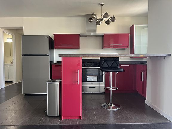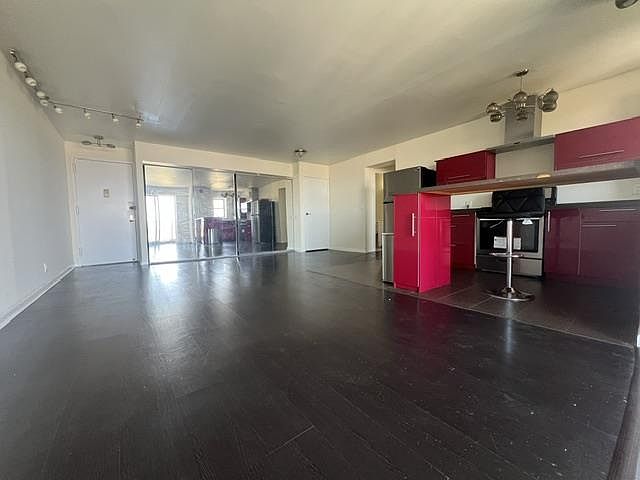 Large open living spaceStainless steel appliancesGorgeous floorsAbundant closet spaceRed kitchen