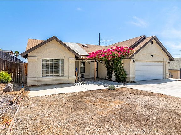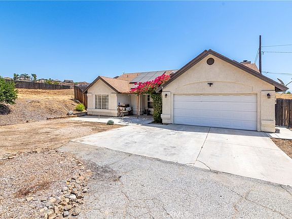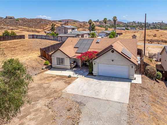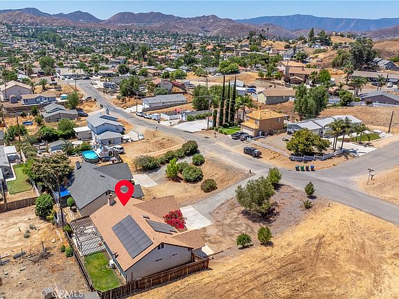 This adorable / move in ready single story home is situated on a large private lot with plenty of room for RV Parking! Home features 4 bedrooms 2 baths, just over 1500+ sq ft of open living space. Spacious Family room features beautiful split face stone fire place with raised hearth and oversized wood mantle, tile flooring throughout and adjoins the dining room and kitchen area. Kitchen offers stone counter tops, shaker style cabinets with ample storage, breakfast bar and cozy dining room. Enjoy the wood accent wall and sliding wood barn door. Just down the hall are the guest bedrooms with custom accent walls, ample closet space and charming guest bath. Master Suite boasts tall ceilings, built in shelving and decor ledges, dual closets and a dual sink vanity in the en suite bathroom. Backyard offers a patio area for entertaining and fenced in backyard complete with garden boxes. attached 2 car garage with plenty of storage room! You do not want to miss all this home has to offer. NEW HVAC! New Water Heater. Solar (Leased $220 mo). Located just a few steps from hilltop views of Canyon Lake/Menifee and hiking trails! Low taxes and no HOA. Make your call today to see this beauty!