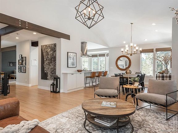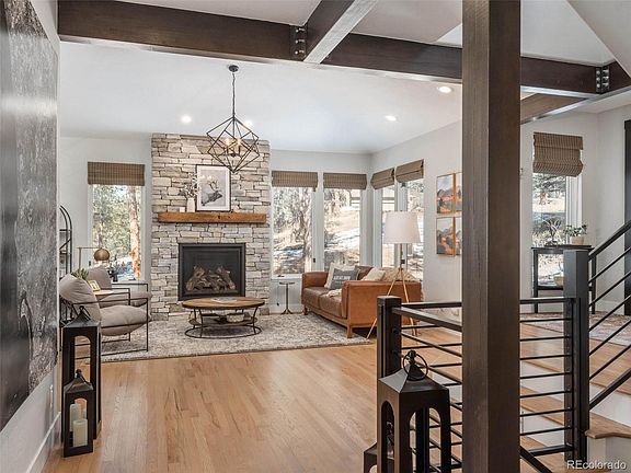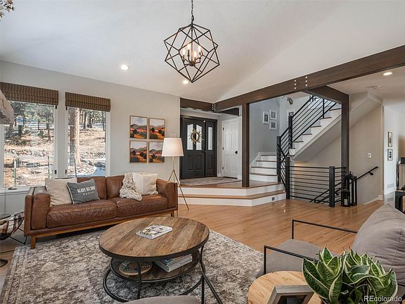 OFFER DEADLINE - SEE BROKER REMARKS. If you are looking for a prime Evergreen location with snow-capped views, you’ve found it in this on trend, open concept, fully remodeled mountain contemporary retreat. Those of us who live in the western foothills love endless outdoor activities, beautiful views, and access to city culture. Those who live in the coveted Ridge at Hiwan enjoy all of that and extreme convenience. Just minutes from daily amenities and downtown Evergreen, this location is hard to beat. The main level is ideal for indoor/outdoor entertaining with dual open flow living areas, open concept renovated kitchen and a 15 foot 4-panel, multi-slide door that opens the full wall length to the large back deck and forever treed and mountain views. The doors, the deck, the views, and summer al fresco dining are calling your name! Upstairs houses a loft library perfect for a good read, music room or home office. Double entry doors lead from the multi-use loft to the primary suite with views, a fireplace, and a designer spa worthy bath. Adjacent to the primary suite are two generous secondary bedrooms that share a contemporary remodeled Jack-n-Jill bath. Walk-out levels are chalk full of value and this one does not disappoint. Creative use of space offers a home gym or a second office location and big windows and an artistic accent wall complement the family/rec room. Do your guests and family love to spend time in Colorado? They may stay forever in the generous lower level suite with a private remodeled bath. Gentle land is tough to find in the foothills, but this lot offers access from the rec room to a wonderful, usable backyard space with room to roam and play. Explore through the trees and find your way to the trail access that will take you to Elk Meadow and the must do Bergen Peak climb. Added bonuses include no maintenance/fire safe cement siding, stone coated steel roof, heated and oversized 3 car garage with a workshop, and a virtually brand new furnace.