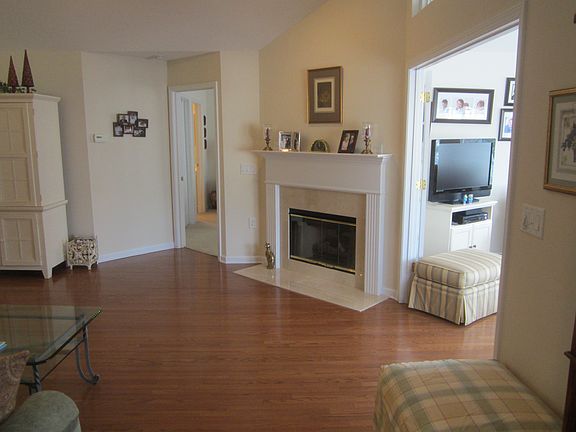Great floorplan, lots of natural light. Bright sunroom with relaxing views and ceiling fan. Hardwood floors throughout, upgraded carpet in bedrooms. Master bedroom with en suite master bath with ceiling fan. Oversized second bedroom with private entrance to full bath. Spacious walk-in closets in both bedrooms. Bedrooms fit King size beds & complete furniture sets. Ceiling fan in each bedroom, third ceiling fan in master bath. Spacious kitchen includes new microwave over smooth cooktop and solid surface countertops with breakfast bar, cherry cabinets, ceiling fan, and cable/Internet/phone outlets. Kitchen features additional cabinets and countertops for added storage. Airy dining room and living room spaces with gas fireplace. Laundry room, large pantry, attic storage, security system, monthly HOA fee is $280. Wide two-car garage with storage space.