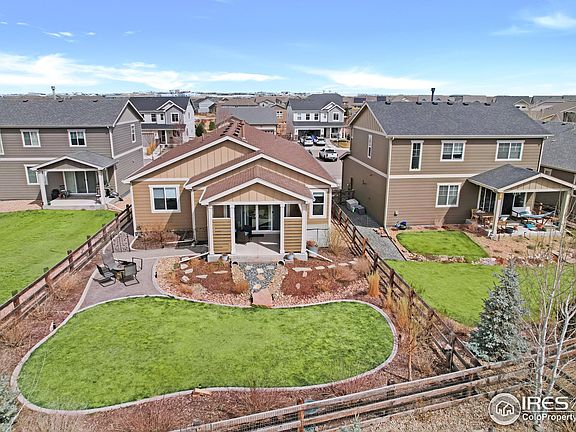 Must see this spotless home with a Large Private Backyard! This charming, bright Ranch is perfectly situated next to miles of trails in a beautiful community packed with amenities! Built in 2020 and meticulously maintained, the Open Floor Plan and Large Windows offer a cheery feel with plenty of space for entertaining. From an Oversized Kitchen Island and Custom Window Shades to a Modern Gas Fireplace and Massive Triple Slider Doors, you'll feel the custom style and livability throughout. Kitchen has all Stainless Steel Appliances, a Gas Range Convection Oven and a Large Kitchen Island. Corian Countertops and White Cabinets. Great Room is big enough to hold a crowd! Laminate easy care flooring throughout, Carpet in Bedrooms. Main Floor Laundry includes Washer & Dryer. 3 Bedrooms PLUS a Tech Center-Office/Game Room. The enormous Primary Suite includes a generous walk-in closet and spacious 4Pc.bath with the laundry room conveniently situated close-by. New Loft Storage Area in Garage! HUGE STORAGE SPACE UNDER FULL LENGTH OF THE HOUSE-- 4' CRAWL SPACE with plastic liner and lighting. Relax on the private back patio and take in the beautifully landscaped, low-maintenance backyard, with Concrete Edging, (90% of plants are on drip lines), or take a stroll to Houts and Equalizer Lake, Kids Adventure Park, Dog Park, The Lake Club or the Gardens at High Plains Environmental Center. You won't want to miss the best of quiet cul-de-sac living, so don't wait to come take a look! Dryer vents were just professionally cleaned. EXCELLENT LOCATION-CLOSE TO I-25, SHOPPING AND SCHOOLS.