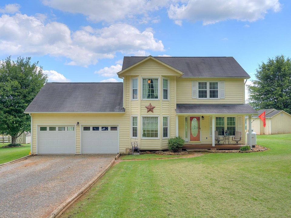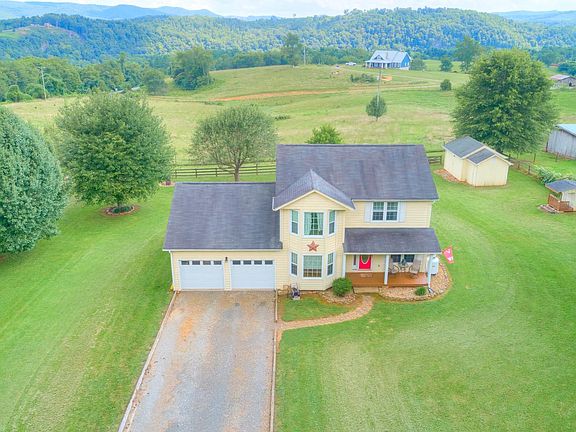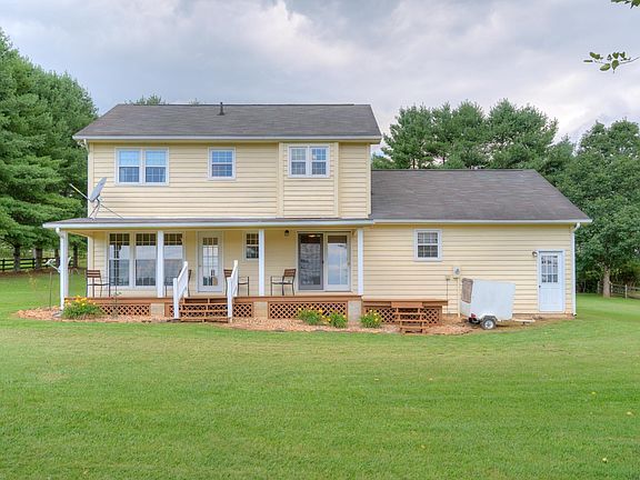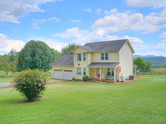This country setting colonial is over 1 acre of land near the New River; beautiful views of our surrounding Blue Ridge could be your sanctuary! Enter via the covered front porch. Cozy living room with gas log fireplace, large windows at front and back, hardwood floors. Half bath. Adjacent dining room boasts hardwood floors, beautiful wainscoting around the room, a bay window and plenty of space for a full dining room set! Adjacent kitchen walks out to a large covered back porch across the house, looking out over the oversized back yard and rolling hills. Laundry access convenient to kitchen, as well as access to the connected 2 car garage. Xtra large bedroom/ office/ bonus room above the garage. Upstairs are three spacious carpeted bedrooms and full hall bath. Master bdrm has a private bath with soaking tub, newer vanity, and a walk in closet. Quiet rural setting, but only a few miles from I81 for commuting, shopping. Country living with small town conveniences nearby- a must see!