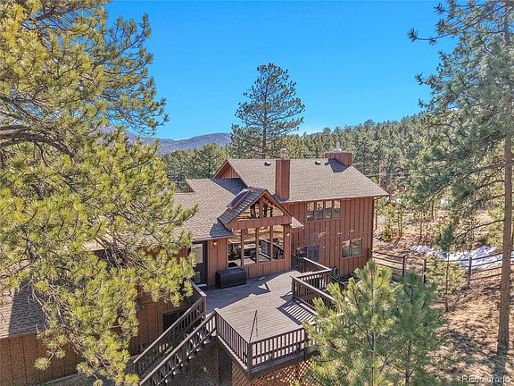 Welcome to 29571 Dorothy Road in Evergreen, CO, a stunning property nestled in Evergreen Park Estates. Priced at $895,000, this home sits on 2 beautiful, usable acres, providing quick access to schools and scenic trails in the nearby Three Sisters Open Space. Step inside to discover a grand 28x28 living room featuring vaulted beamed ceilings, a cozy fireplace, custom bookshelves, and a wet bar. The open layout seamlessly connects to a formal dining area with a wall of windows and skylights. The kitchen is a chef’s delight, boasting a large center island. Off the kitchen, a mud/laundry room includes a three-piece bath and leads to a spacious deck, perfect for outdoor entertaining or relaxing while wildlife wanders by. The primary suite includes a walk-in closet and access to the front patio. Two additional bedrooms and a full bath complete this level. The lower level offers a large office, storage room, and a family room with a bay window and gas stove. Additional features include a two-car garage with high ceilings and built-in shelving, abundant crawl space storage, a freshly repaved driveway, a new roof, and a fenced yard. Experience the perfect blend of comfort and nature in this remarkable home