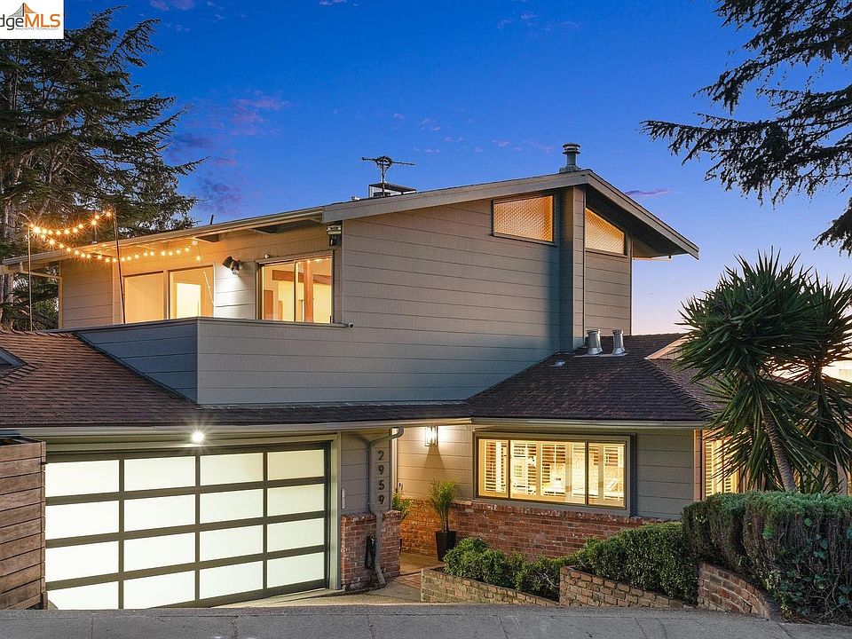 Sleek spacious mid-century with just enough drama to captivate. Great views, but still easy access to amenities and transportation corridors. Level entry to main floor with 3 bedrooms, 2 remodeled baths, beautifully redone kitchen. Downstairs a great room with spa bath and fireplace - a wonderful retreat. Upstairs is a huge superbonus room with bath and entertaining area - a fabulous retreat or an amazing game room with a roof deck and jaw dropping bay and city views. Flexible floor plan for your style now and in the future. Close to the 500 acre Joaquin Miller Park, dog park, Woodminster Amphitheater, Kokua Park, bike and hiking trails, L'acajou cafe. Woodminster Market, Montclair Village.