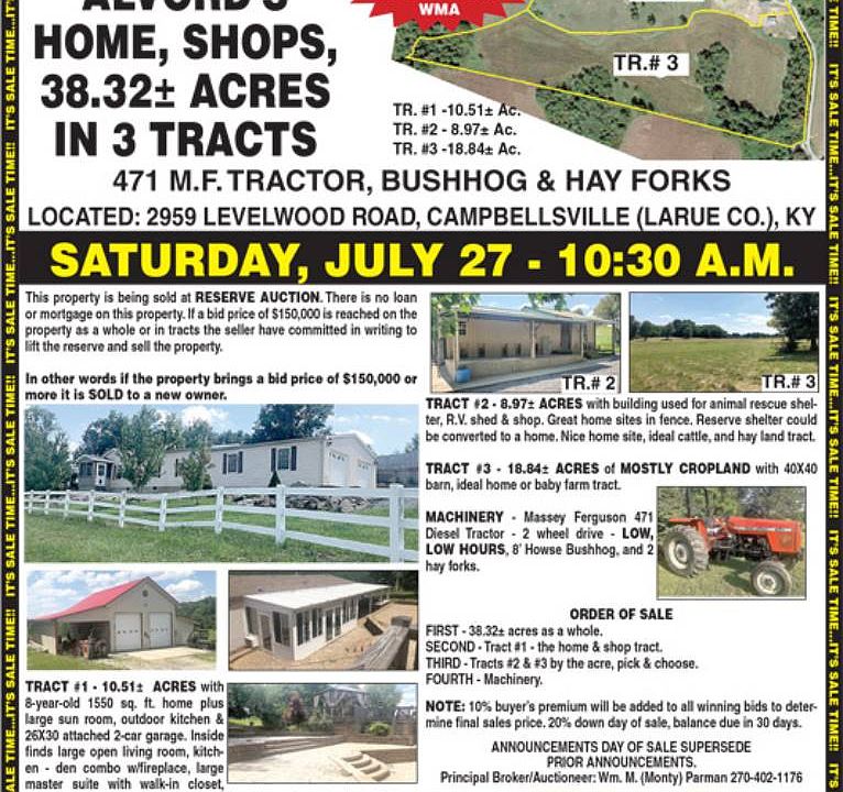 Coming Auction July 27, 2019 at 10:30 am Home, Shops and 38.32 Acres M/L. In 3 Tracts Located 2959 Levelwoods Road Campbellsville KY. In Larue County