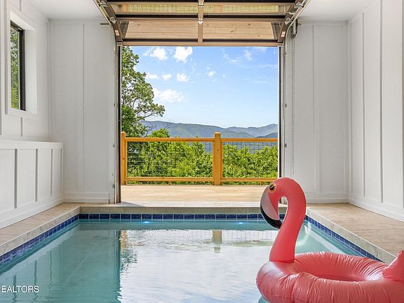 NEW CONSTRUCTION/JUST COMPLETED! THREE BEDROOM with TWO BONUS ROOMS plus a loft, game area and sprinkler system! INDOOR POOL w GLASS GARAGE DOOR! The builder just finished final touches on this stunning indoor pool Smoky Mountains Cabin with Incredible Views! Escape to your dream mountain retreat! This luxurious cabin boasts breathtaking views of Wears Valley and privacy that is difficult to find in the Smokies. You can't see another cabin from this property, and there is a grassy area behind to enhance the outdoor living space. With nearly 4,000 sq. ft. of space, this 3-bedroom masterpiece, WITH SPRINKLER INSTALLED, invites you to create your perfect mountain getaway. Step through elegant double glass doors and be greeted by pass-through views of the majestic mountains, framed by 16' sliding glass doors that open to an expansive deck. Whether you're relaxing indoors or outdoors, the seamless connection to nature will take your breath away. The indoor pool is a showstopper, featuring a glass garage door that brings the outdoors in, with direct access to the lower deck and gently sloped outdoor space—perfect for entertaining or quiet moments of reflection. The lower level is entertainment central with a theatre room nearby the pool. This cabin is loaded with luxury finishes, including: Paved driveway, granite countertops, stainless-steel appliances, LVP flooring for durability and style, walk-in tiled showers, tongue-and-groove ceilings, soaring ceilings that create an open and inviting atmosphere. Located in a gated community with added amenities like a picnic area and private dumpster for residents, this cabin is just: • 15 minutes to the excitement of Pigeon Forge • 7 minutes to the Great Smoky Mountains National Park entrance • 5 minutes to the scenic Foothills Parkway This is more than a home or investment—it's a mountain escape like no other. Don't miss your chance to own a slice of Smoky Mountain paradise!