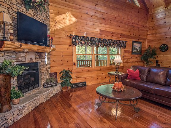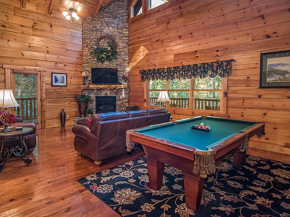 Located in the Prestigious Smoky Cove Resort. "Peaceful Easy Feeling" is a 3 level, luxury cabin located in a beautiful resort setting convenient to all attractions plus the Smoky Mtn National ParK. Maybe you just want to sit on the porch and do absolutely 'Nothing. ''Peaceful Easy Feeling ' is everything you could ask for in a home away from home. A cabin is a great place to unwind and sit by the fire, relax on one of the porches, cook on the new stainless grill or sit in the hot tub to soak your cares away. DESCRIPTION: This cabin has 3 King Master Suites both with full baths and 2 of them with a Jacuzzi tub right in the room. The cabin is loaded with all of the amenities you, your family or friends could ask for. Relax in the large great room on the leather sofa or chairs by the stacked stone fireplace while watching your favorite Blu-Ray Movie on the large 42" Flat Screen. If that is not enough step just right off of the Great Room to a game of pool. You may want to enjoy one of the 3 KING SUITES each with its own " Flat Screen TV, Queen Sleeper Sofa and gas fireplace.The main level has a Large Great Room with access to the full size porch that is equipped with Rockers as well as a Hammock Swing. The main floor also has a Full Size Kitchen with deluxe appliances and a dining area and a 1/2 Bath. Large Master Suites with a King size beds on Main Floor, 2nd floor , and lower floor if renting as a 4 bedroom option. " flat Screen tv's, jacuzzi tubs in the rooms as well as gas log fireplaces and a full baths with walk in showers. The upper level has a a large sitting room with a leather loveseat to sit and read or just have your own quiet time. The Lower floor has a KING SUITE with " Flat Screen TV,Jacuzzi Tub,Stacked Stone Fireplace and leather sleeper so you can enjoy a game on the TV while sitting by the fireplace. A third full bath with a large walk in shower. New HVAC 2017 both units, New Stain 2016, Floor refinished 2015. This one you need to see!