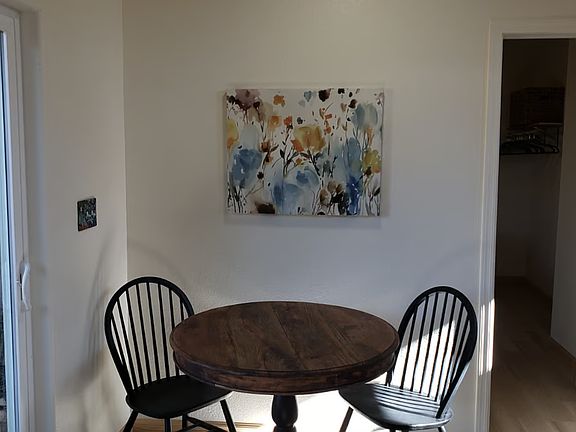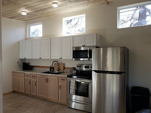 All utilities included, even wifi! Beautiful cabin, perfect for those who enjoy being outdoors. Features a well appointed kitchen, dining area, bedroom, fully fenced yard, and beautiful pines and National Forest trails a short walk out the front door. Quiet neighborhood, near the National Forest - 10-15 minute drive to Flagstaff proper. Electric, water, and sewer included in monthly rent. This is a really special property, with design elements that mirror the outdoors with pine on the ceiling, waterproof flooring, clerestory windows throughout, and natural wood furniture. Upon entering you'll see an open living area with a cozy leather rocking sofa, a Smart TV, and room to relax. The dining room and kitchen are fully stocked with pots, pans, baking sheets, cooking utensils, tupperware, and so much more. The cabinette also has a minisplit to provide heat in the winter and AC in the summer to keep you comfortable year round. The bedroom has a memory foam mattress, a full dresser, closet rack, and an en-suite bathroom. Tenant will need to get a PO box for mail. Minimum 3 month lease. Owner pays for all utilities, including Wifi. Up to two pets allowed. No smoking of any kind allowed on the property. Off-street parking is limited - could fit up to two compact vehicles.