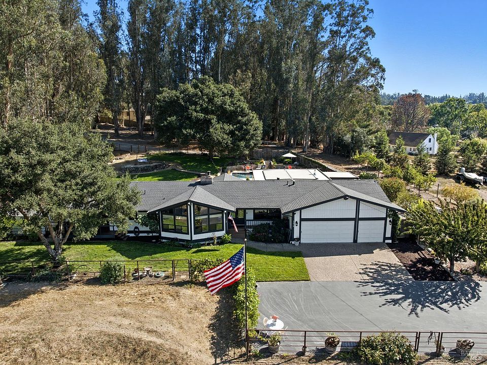Private and peaceful setting in Cotati! This beautifully updated 3-bedroom, 2-bath home offers a perfect blend of comfort and style. Hardwood floors flow throughout, while the bathrooms feature elegant travertine and tile finishes. The oversized kitchen is a chef's dream with granite counters, marble backsplash, maple cabinets, stainless steel appliances, wine refrigerator, gas stove with warmer, and plenty of prep space. A separate laundry room includes storage and a sink. Recent updates include a newer HVAC system, water heater, and freshly painted exterior. Enjoy your backyard oasis with built-in BBQ, pizza oven, cooktop, icemaker/cooler, and granite counters. The stamped concrete patio includes an electric awning with recessed lighting and ceiling fan. Relax by the built-in pool with safety cover, soak in the hot tub, or gather around the firepit. The property also features an extra-large two-stall barn with tack room and walk-in meat refrigerator, dog run, two chicken coops, she shed, greenhouse, large pasture, and garden beds. The property features a variety of fruit trees, including: citrus, olives, peaches, pears, apricots, plums, cherries, pomegranates and apples. Security system with cameras included. Private yet close to town, this home is a true country retreat!