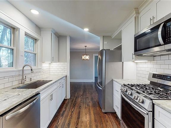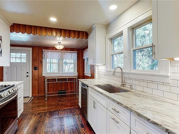 Charming updated bungalow with privacy and still within walking distance to the Village! 2018 renovation including new kitchen with white cabinetry, granite countertops and backsplash, stainless appliances, pantry and island prep area or quaint eating space. Kitchen opens to dining room and spacious living room with fireplace and built-ins. Two bedrooms and remodeled full bath with walk-in tiled shower on the 1st floor. The 2nd floor features a master suite with extra living space or desirable spacious walk-in closet. Refinished hardwood floors, designer lighting and newer windows throughout. Fully finished lower level including rec room and bar, 2nd full bath and laundry room. Four season porch off the living room with plenty of light and beautiful scenery overlooking the mature trees and sitting high atop the Village homes below. 2 car detached garage. Two parcels of almost a half acre of land with green space and room to expand. Truly a place you will call Home Sweet Home!