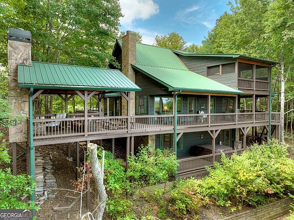 INCREDIBLE MOUNTAIN ESTATE THAT HAS IT ALL!! This 4 bedroom w/large loft, 3.5 bath mountain estate sits on 5.13 acres, very private and boasts a long-range mountain view with gated entrance, spacious primary suite showcasing the view, primary bath w/double vanities and custom tiled shower and jetted tub; Chef's kitchen w/custom cabinets, tiled backsplash and open to lodge room w/wall of windows displaying the long-range mountain view and floor-to-ceiling stacked stone fireplace; finished terrace level w/stacked stone gas-log fireplace, custom tiled wet bar, bunk room, and recreation room; expansive decking for entertaining, expansive outdoor party porch with wood burning fireplace, hottub on lower level, screened in porch, 2-car detached garage with attic storage, separate multi-use workshop or art studio, ample parking AND located within 5 miles of downtown Blue Ridge for great shopping and dining.