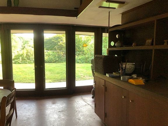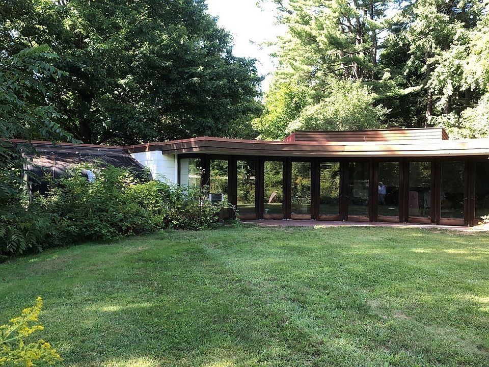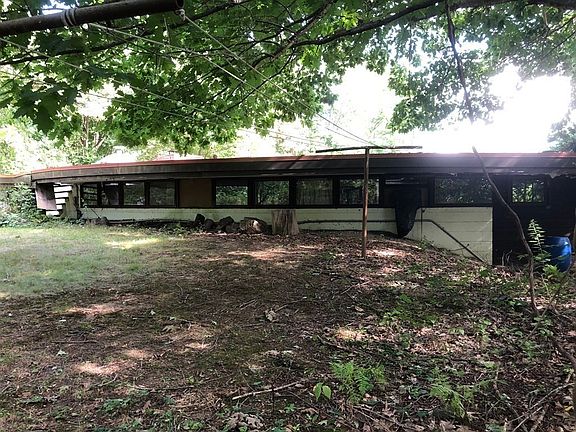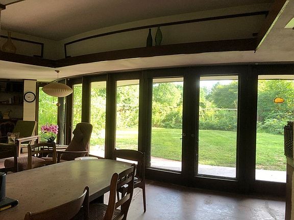 Classic Usonian style home is looking for a new owner! Based on the Frank Lloyd Wright "solar hemicycle" design, it features the front wall of windowed doors facing south, multiple skylights for natural lighting, wide roof overhang to aide passive heating and cooling, flat roof cantilevered so water sheds to the berm at the north facing rear of the house. (Imagine all of this built in New England in 1956, as remarkable as its original owner!) As much thought and planning was given to the property with a fence mirroring the half circle of the house so the front yard landscaping is integral to the living area. The driveway entrance featured a lily pond and natural plantings while a well planned greenhouse allowed the owner to indulge exotic plants, especially orchids. The open floorplan and radiant floor heat also make the construction wonderfully contemporary. Now it needs someone to restore its many unique features; come see!