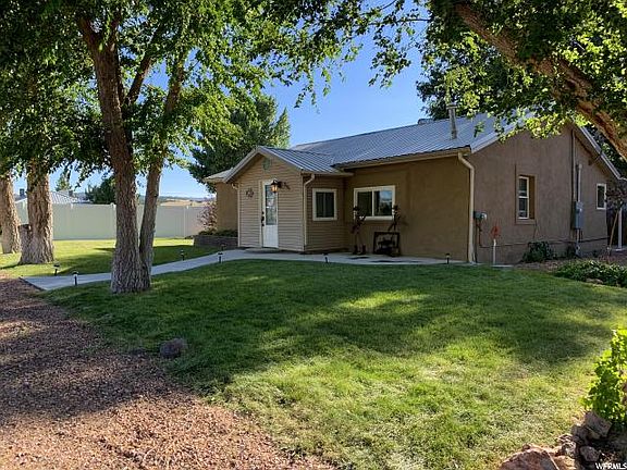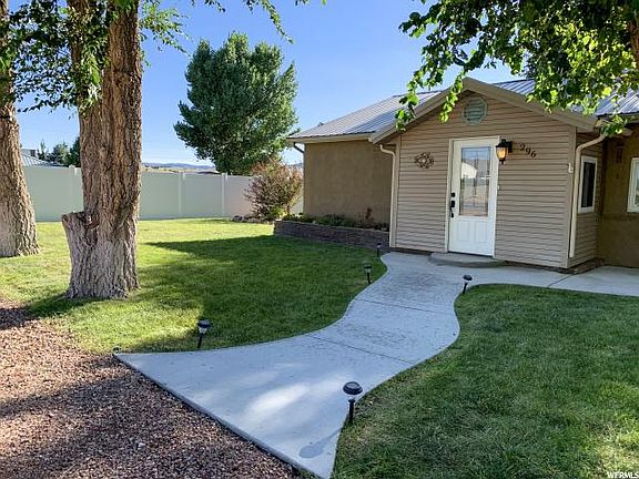 Situated on a corner lot, this unique home is sturdy with extra thick walls that does an amazing job to insulate from heat and cold. Spacious updated kitchen with soft close cabinets and granite countertops. Large garden tub in the main bathroom, and convenient half bathroom right off the mud room. Cold storage in the basement. The shed out back has been insulated and finished to offer additional storage and flex-space and has been used as guest quarters and sewing/craft room with storage in the loft. Enjoy the breeze and cool shade on the covered patio. Plenty of parking and space for a RV or trailer. The storage container offers even more storage and has a roll up door accessible for parking 4 wheelers or side by side.