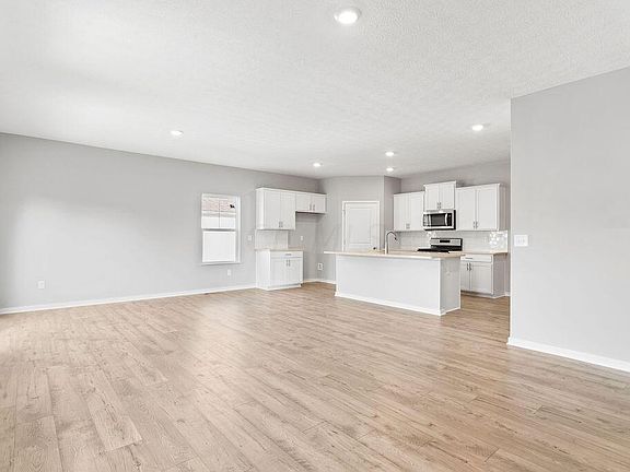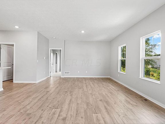 This charming ranch home with 3 spacious bedrooms & 2 full baths will win you over w/ it's open layout & soaring 9-foot ceilings. The large great room is open to the kitchen & casual dining, making an ideal set up for entertaining. The chef's kitchen is equipped w/ stylish cabinets, hardware, quartz countertops, beautiful kitchen island for extra seating or prep space & upg Revwood flooring. Primary bedroom sits alone one side of the home for privacy & features a private en suite bath & spacious walk in closet. Additional stand out features include upgrade hard surface flooring throughout & full basement (plumbed for bath)! Exterior features include modern farmhouse front w/ stone accent, concrete patio and large 3 car g